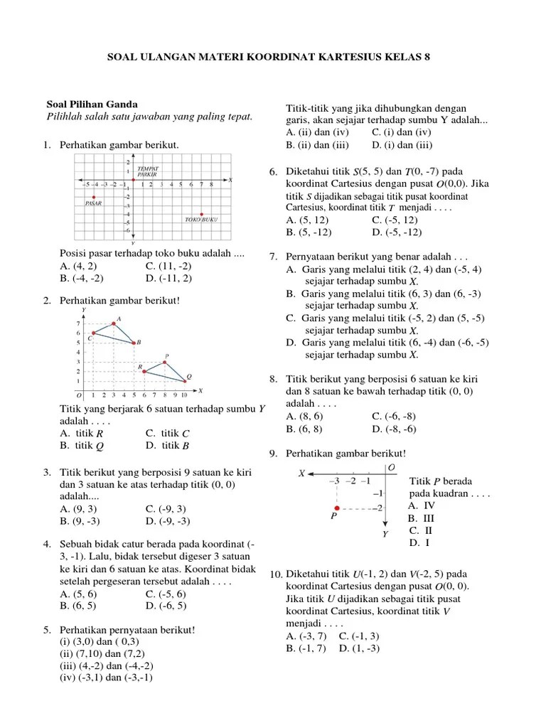 Belajar memahami sistem koordinat kartesius. Selanjutnya, di kelas 8 smp, siswa kembali mempelajari materi ini secara lebih mendalam. Lembar kegiatan peserta didik sekolah menengah pertama sistem koordinat kartesius kelas viii, dimaksudkan supaya peserta didik lebih termotivasi dalam . Play this game to review mathematics. Daftar isi bab 1 pola bilangan bab 2 koordinat kartesius bab 3 relasi dan fungsi bab 4 persamaan garis lurus bab 5 sistem persamaan linear dua vareabel. Jarak titik a terhadap sumbu x adalah. Sumbu x pada sistem koordinat cartesius disebut. Bahan ajar kelas viii materi sistem koordinat. Sistem koordinat kartesius digunakan untuk menentukan setiap titik dalam bidang. Sebagai bentuk latihan, berikut ini disajikan soal . Yaitu tenda 1 pada koordinat (2,0), tenda 2 di para kelompok pramuka tersebut terbagi menjadi empat . Lembar kerja siswa (kelas 8 sistem koordinat). Sistem koordinat kartesius adalah suatu sistem untuk menentukan posisi suatu titik / benda / unsur geometri menggunakan satu atau dua atau lebih .